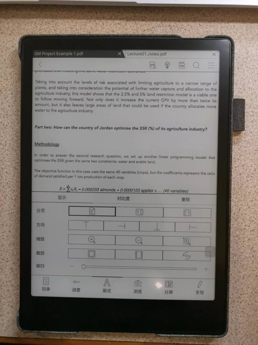PDF阅读我认为应该是大屏电纸书的天职,如果只是阅读MOBI这些格式的书籍,其实没有必要买大屏幕的。Note2得益于超高配置,开放系统和文石阅读软件,是最适合阅读pdf的10.3寸墨水屏设备。响应速度不再赘述,软件上有以下几个我觉得可以睥睨群雄的特色功能(对比度,目录、随意裁边、横屏、提笔就写等基础功能略过不谈,没有前面几种的产品请不要购买)。
